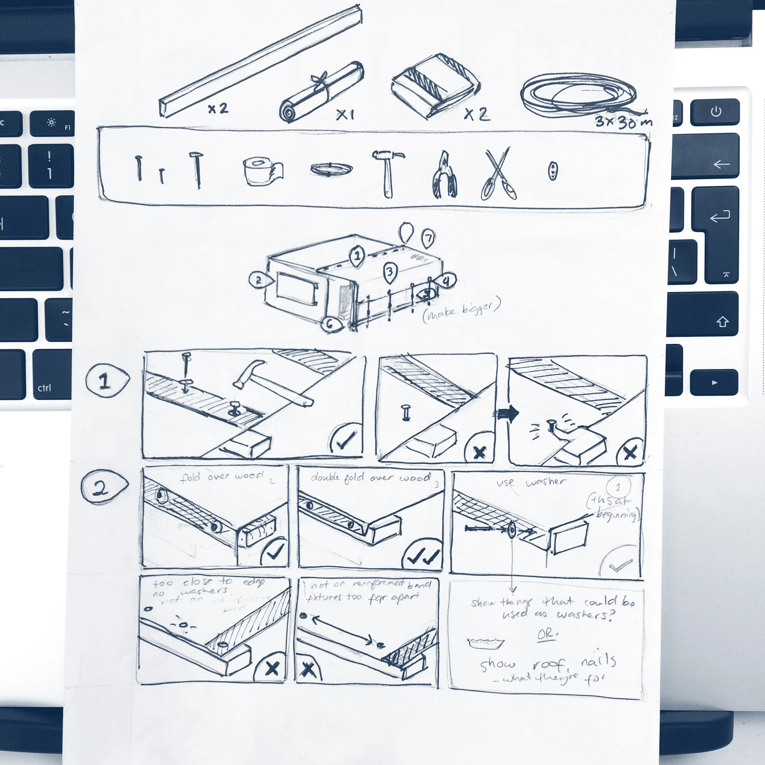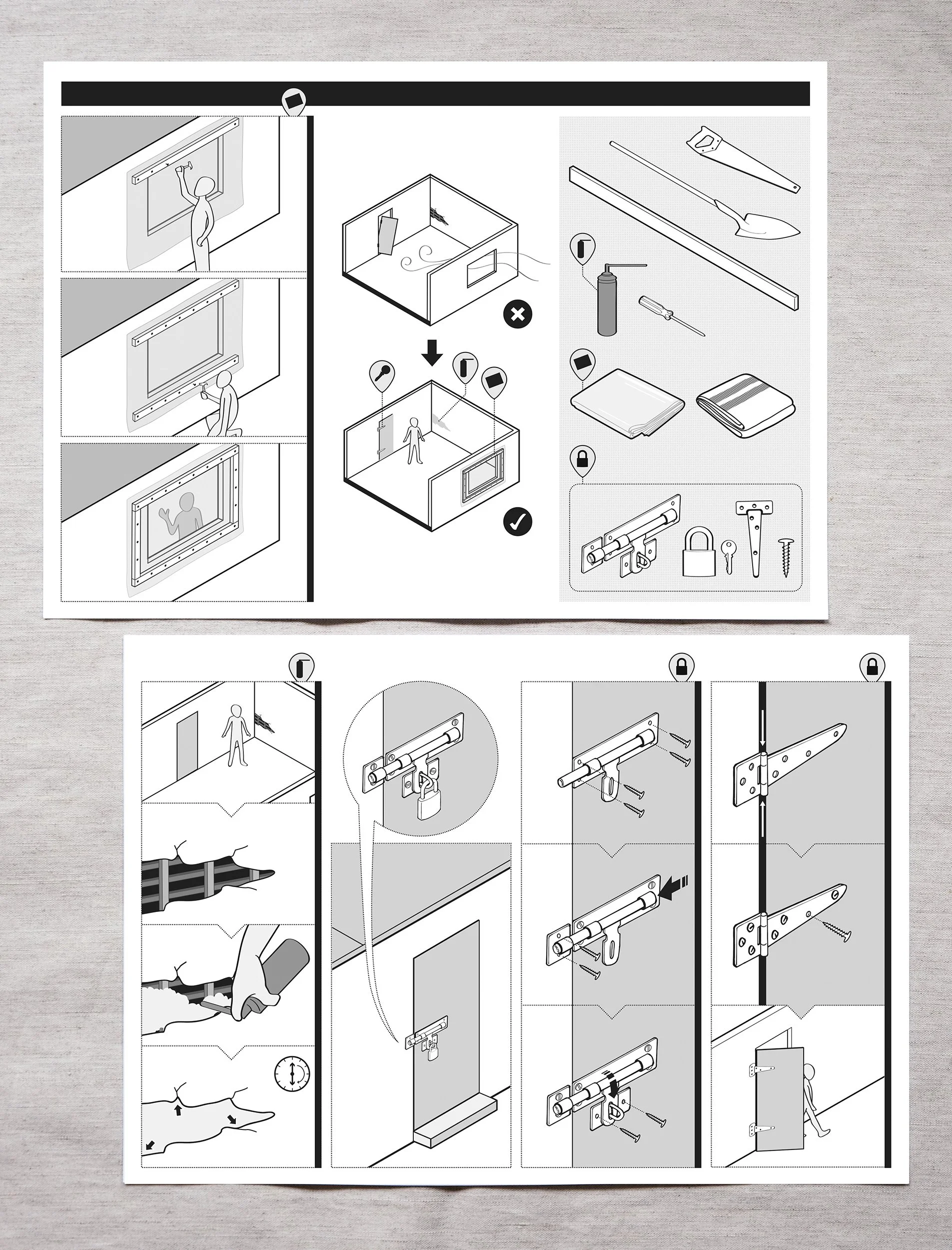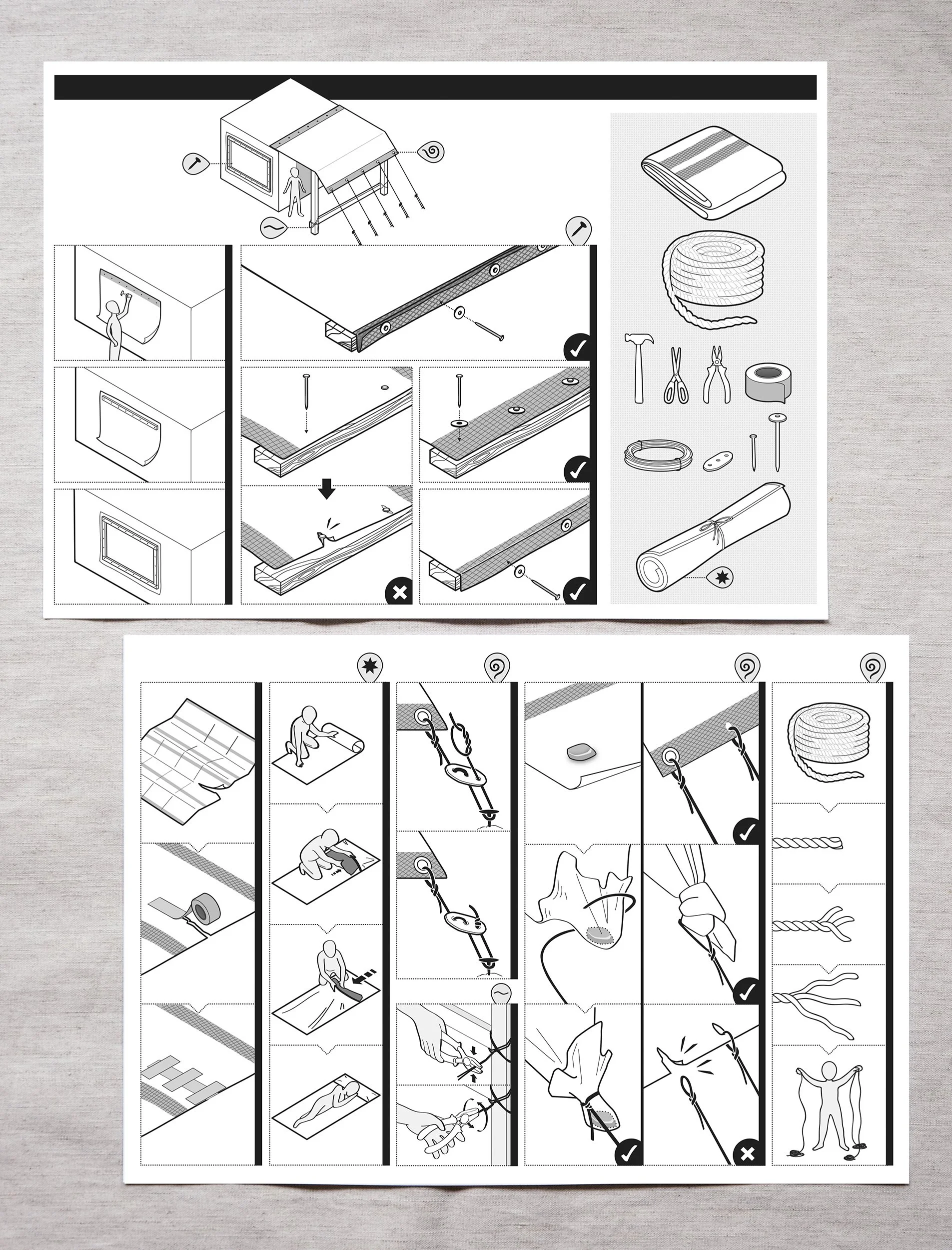 These quick guides were designed to be distributed with emergency shelter kits, which contained tools and materials to allow people to repair or reinforce existing emergency shelters such as tents and damaged buildings.